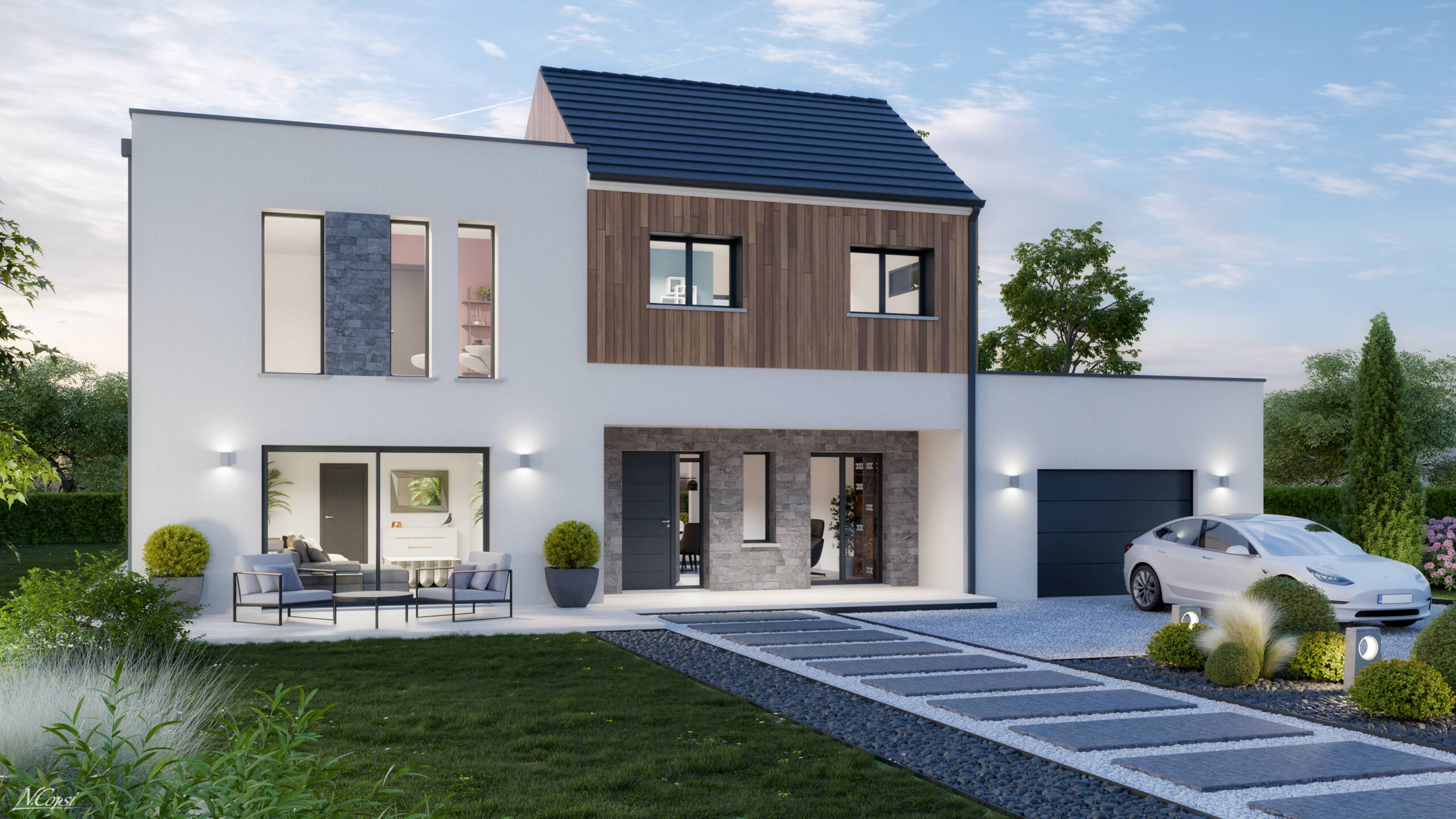 La maison, conforme à la RE 2020 est proposée avec un contrat de construction de maison individuelle, régi par la loi du 19 Décembre 1990 au prix de 164 841 €.
