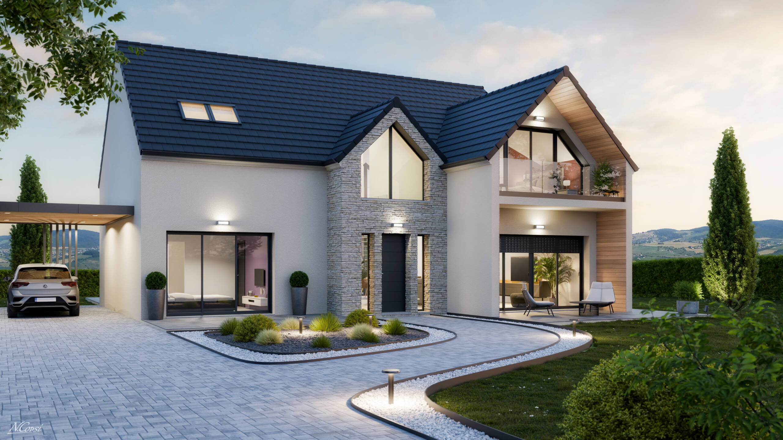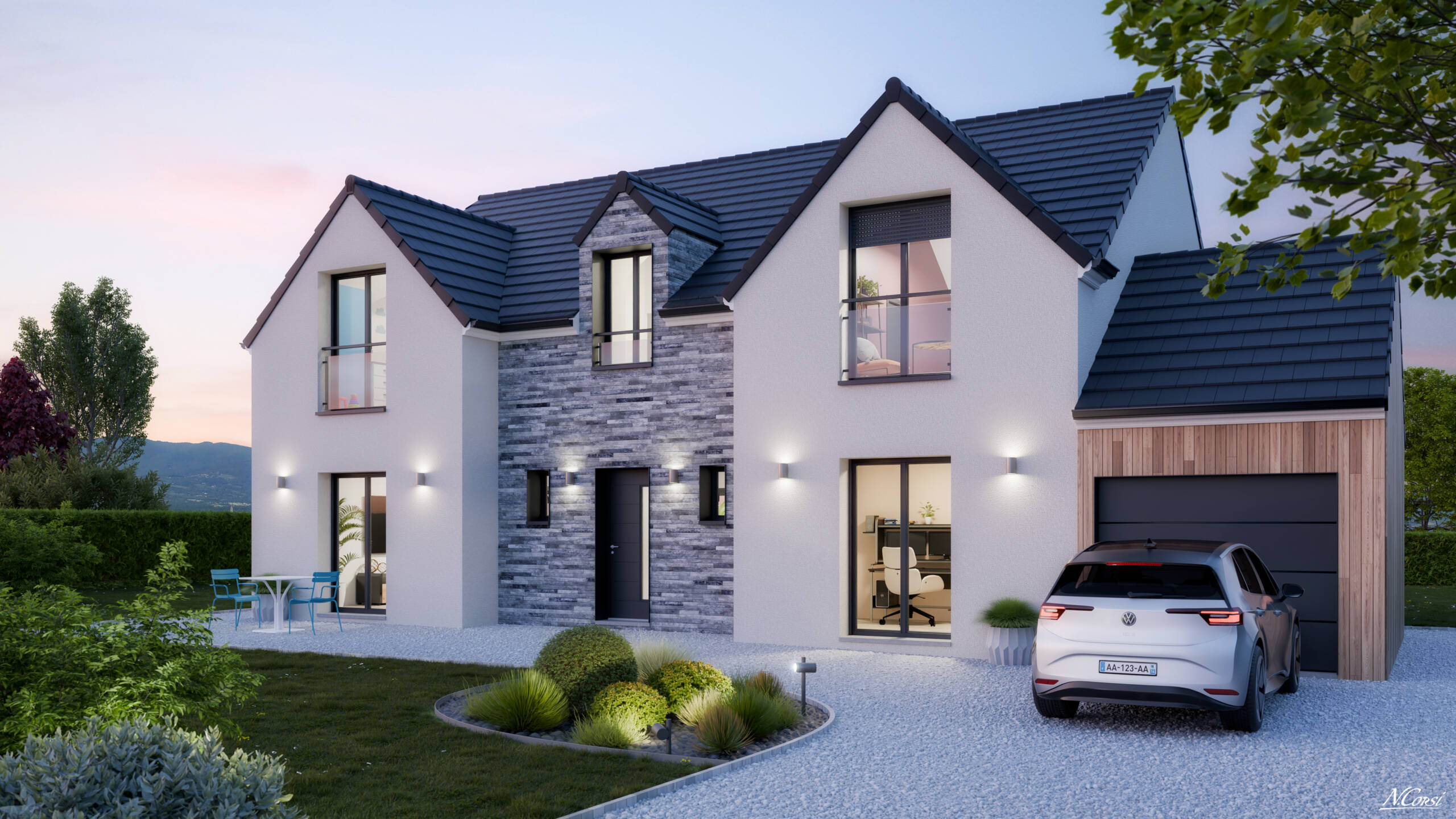 Maison construite en Bio Brique ou parpaing, équipée de volets roulants motorisés avec capteur crépusculaire, pompe à chaleur Air/Eau, écran sous toiture, enduit gratté, cloisons 70mm, gouttières et descentes en aluminium, escalier bois, menuiseries PVC ou Aluminium (en option), porte d'entrée anthracite...